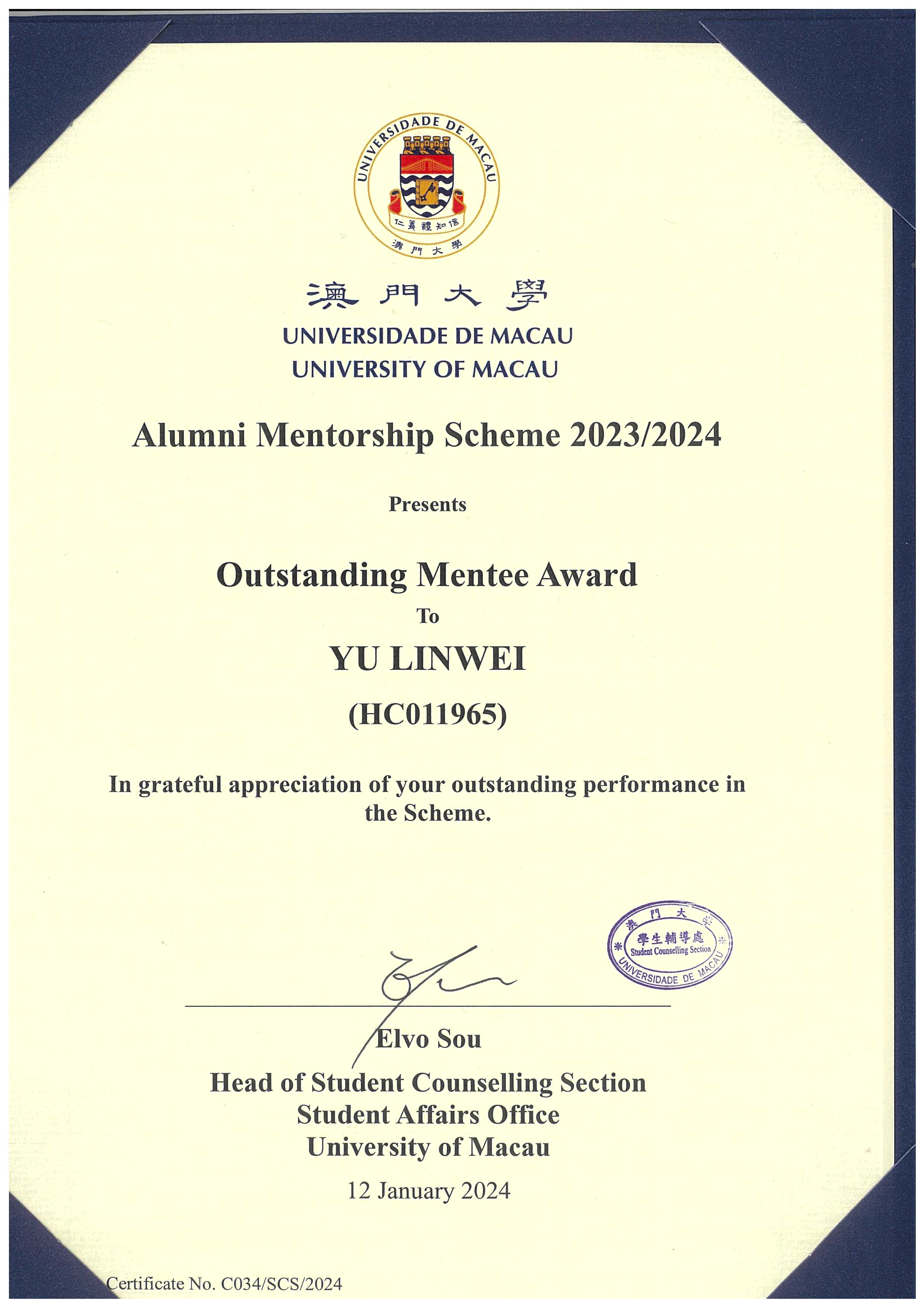 In the academic year 2023/2024, I participated as a Mentee in the Alumni Mentorship Scheme, which was co-organized by the Alumni and Development Office (ADO) and the Career Development Centre (CDC) of the University of Macau. In this scheme, I was inspired a lot by my Mentor Mr. Ping-Lung FONG, and finally received the Outstanding Mentee Award.