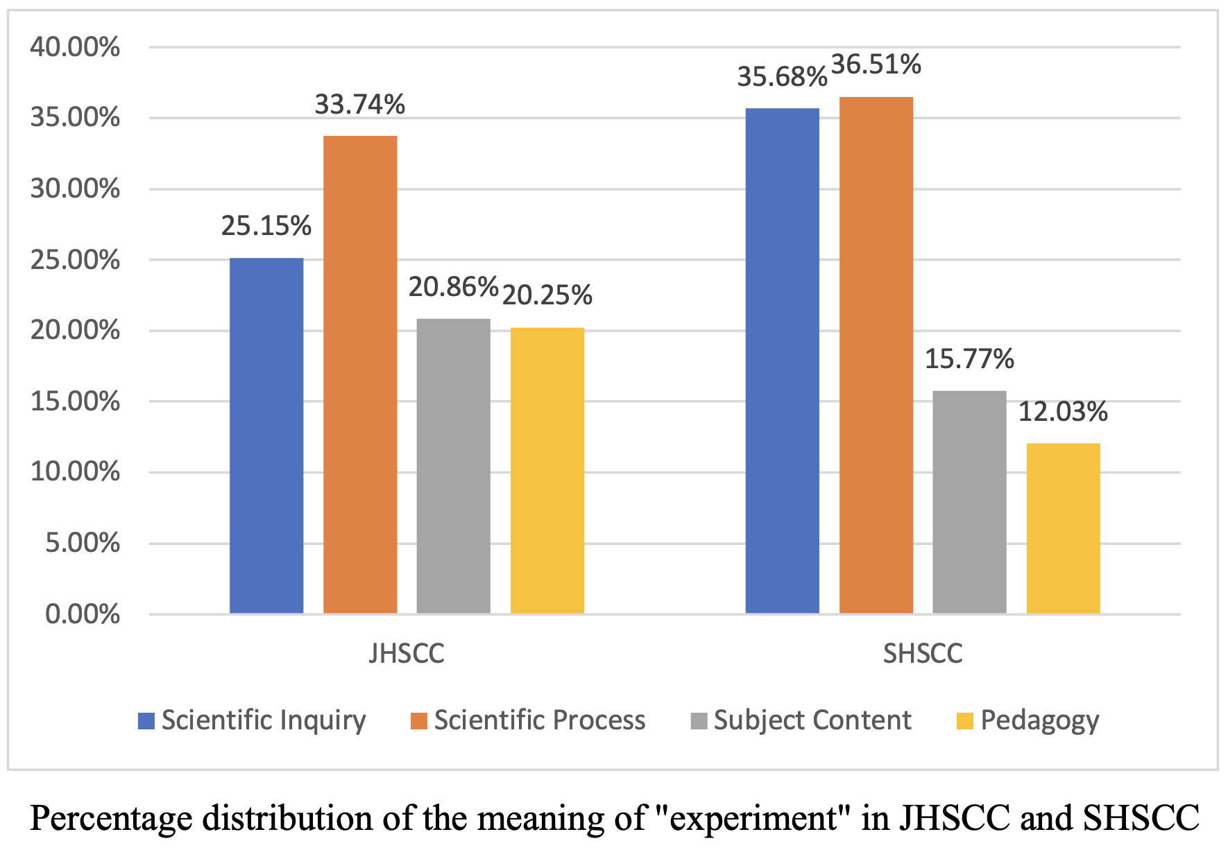 - RQ 1: What are the differences in the distribution of the four meanings of “experiment” in the chemistry curriculum standards of junior high school (JHSCC) and senior high school (SHSCC)?