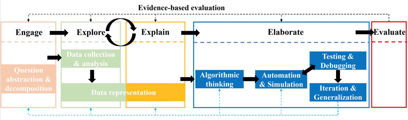 The CT-STEM course process framework proposed in this study was developed through collaboration with Zuokun LI, a Ph.D. student from the Educational Research Center of the University of Macau. Specifically, the CT-STEM course process framework was based on Li et al.’s (2021) relatively comprehensive CT process framework corresponding to the design base learning (DBL) loop. Compared with other CT frameworks, adjustments and refinements were made, especially by adding the essential “testing and debugging” and “iteration and generalization” stages, ultimately creating a CT course process framework flow with seven major steps integrated into the 5E instructional model (Bybee et al., 2006). This resulted in the CT-STEM course process framework shown below: