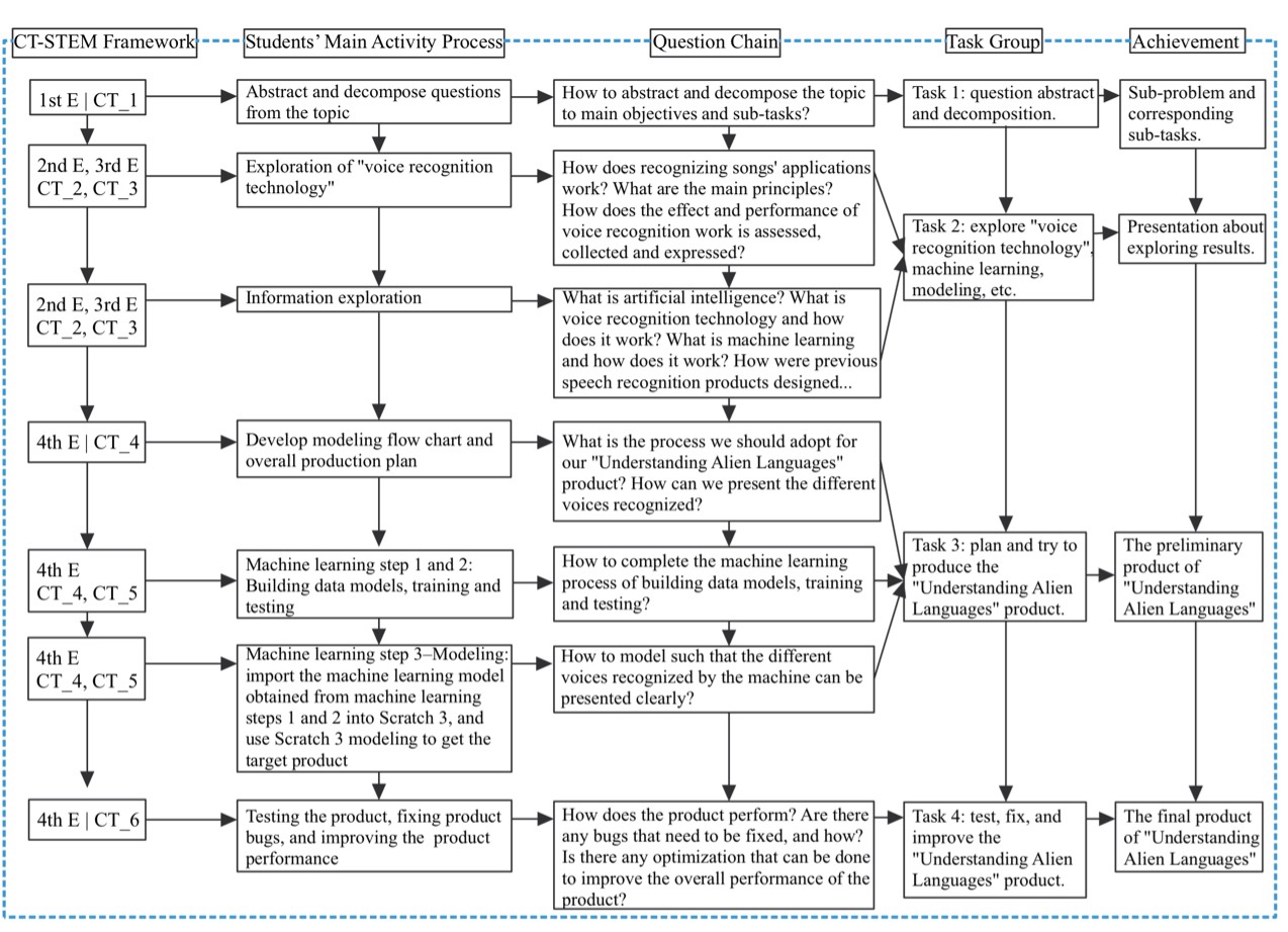 Building on this CT-STEM course process framework, a sample lesson plan titled “Understanding Alien Language” was developed, targeting junior high school students, which incorporates elements of physical acoustics, machine learning, and modeling to provide an engaging experience that fosters computational thinking.